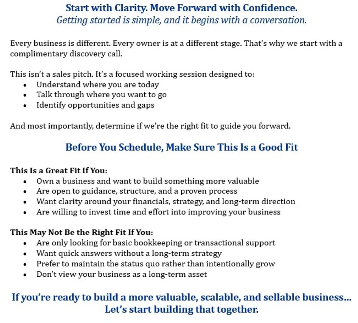 Based on your goals and the current state of your business, we’ll create a clear action plan with flexible service options and transparent pricing, so you know exactly what to expect and how we can assist you.