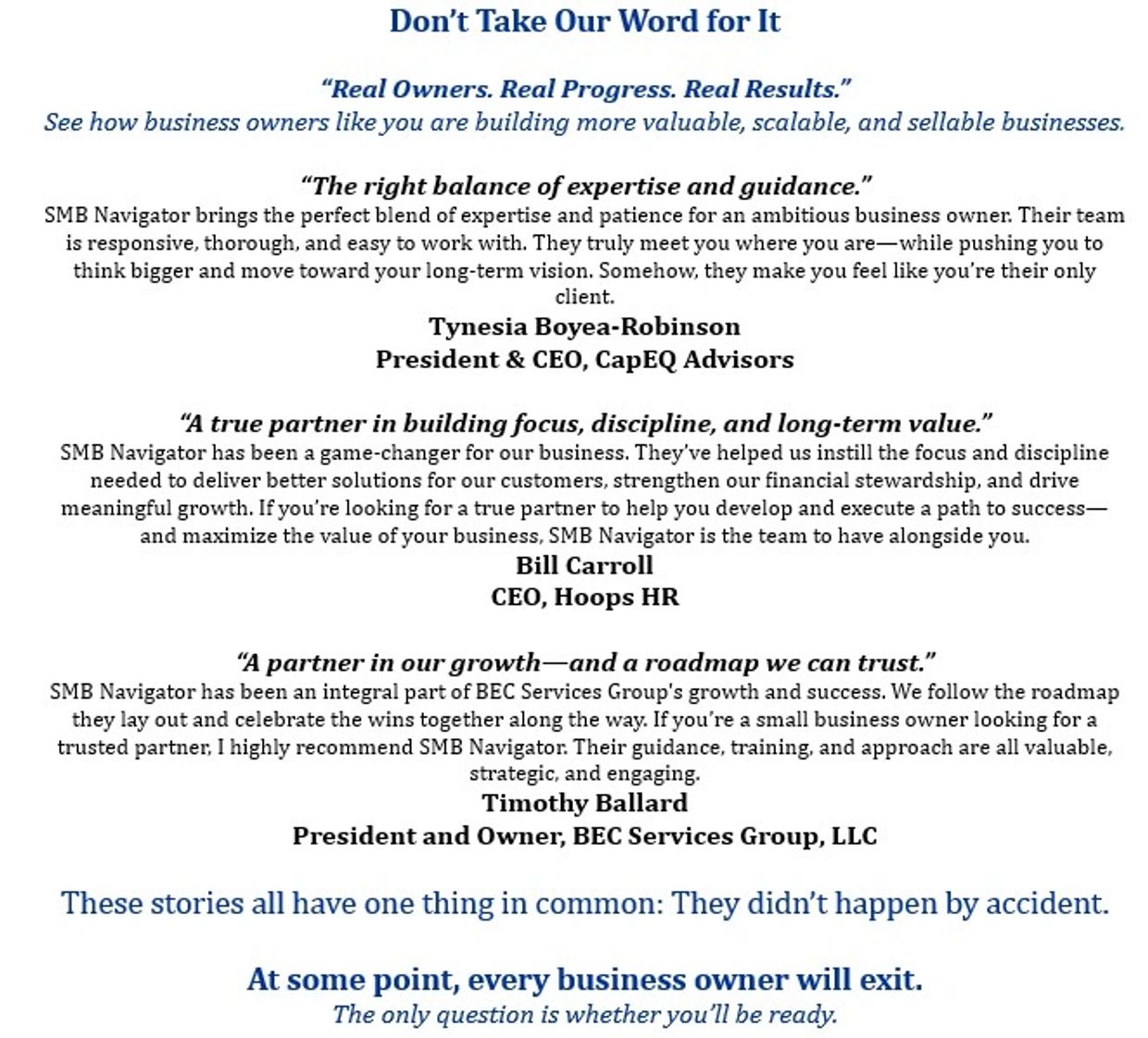 SMB NAVIGATOR has been a game changer for us! They have helped us instill the focus and discipline necessary to deliver better solutions for our customers, be better stewards financially, and grow our business. If you're looking for a true partner that can help you develop and execute on a course towards success and maximize the value of your business - then you need SMBNAV.